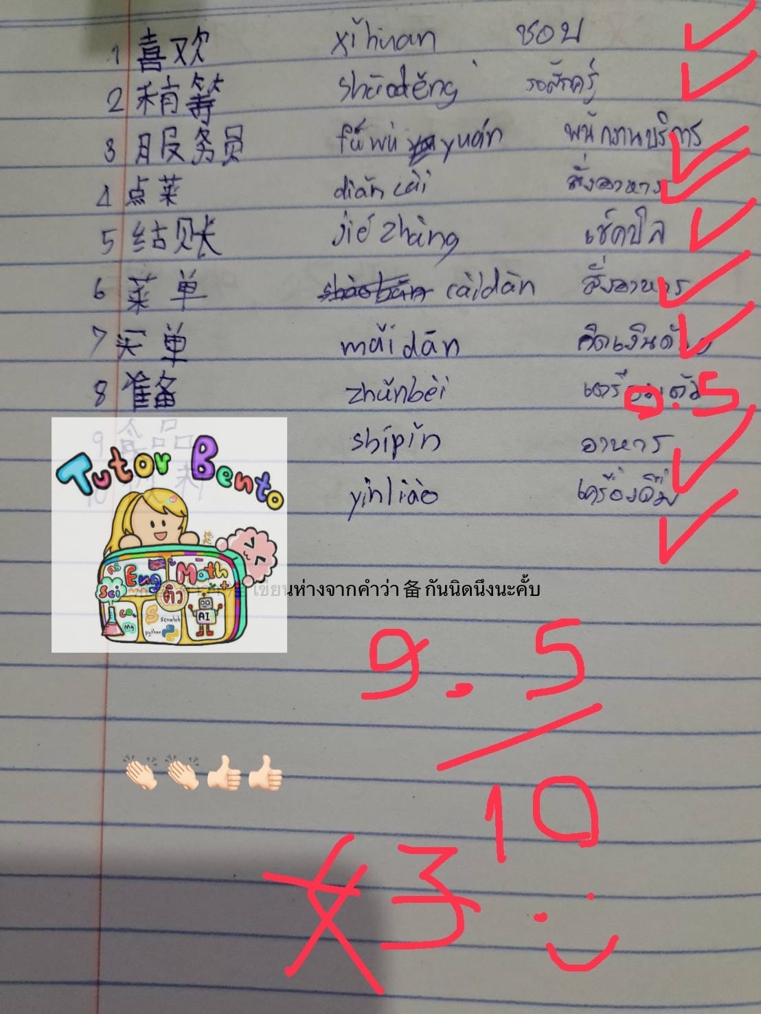 จากการสอนวันนี้ น้องอ่านออกเสียงคำศัพท์ได้คล่องแคล่วและชัดเจนมาก ตั้งใจเรียนมากๆ เรียนรู้ได้อย่างรวดเร็ว กลับไปคัดคำศัพท์ที่เหล่าซือบอกให้ไปคัดเยอะๆนะคั้บ จะได้จำคำและตัวจีนได้เพิ่มมากขึ้น